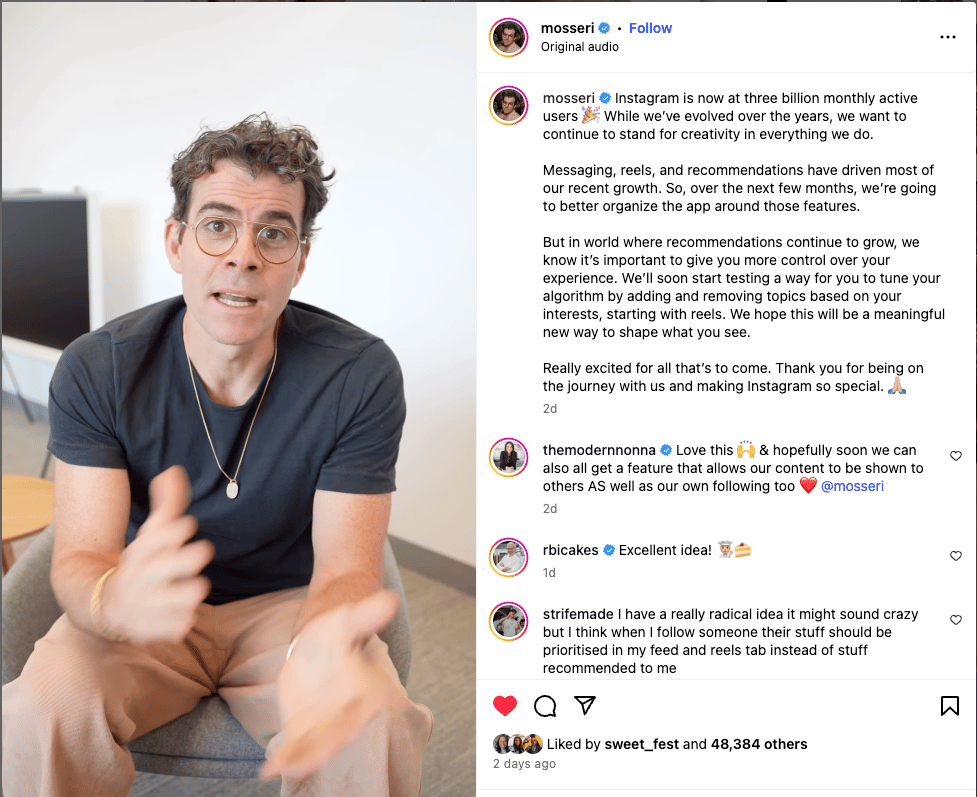 4 months ago • 1 min readBuilding Better Businesses VIEW IN BROWSER Major IG News It's been announced that the algorithm is changing on Instagram (again). Now, listen, we can either be mad about it, or we can pay attention. IG just crossed the 3 BILLION active users mark. THREE BILLION. A thread from a year ago is informing the newest changes to the platform, which, for once, I actually agree with! Click the photo to see the announcement! Register for our upcoming ONLINE Business + Pleasure Events: 10 ways to...